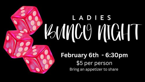 Ladies, join us for a FUN night of BUNCO on February 6th at 6:30pm. Whether you've played bunco before, or this is your first time, we want you to be part of this evening that's sure to bring tons of laughter! You'll also get to know women you only see for a few moments on a Sunday morning, or who might attend a different service than you! Please bring an appetizer or dessert to share with the group.